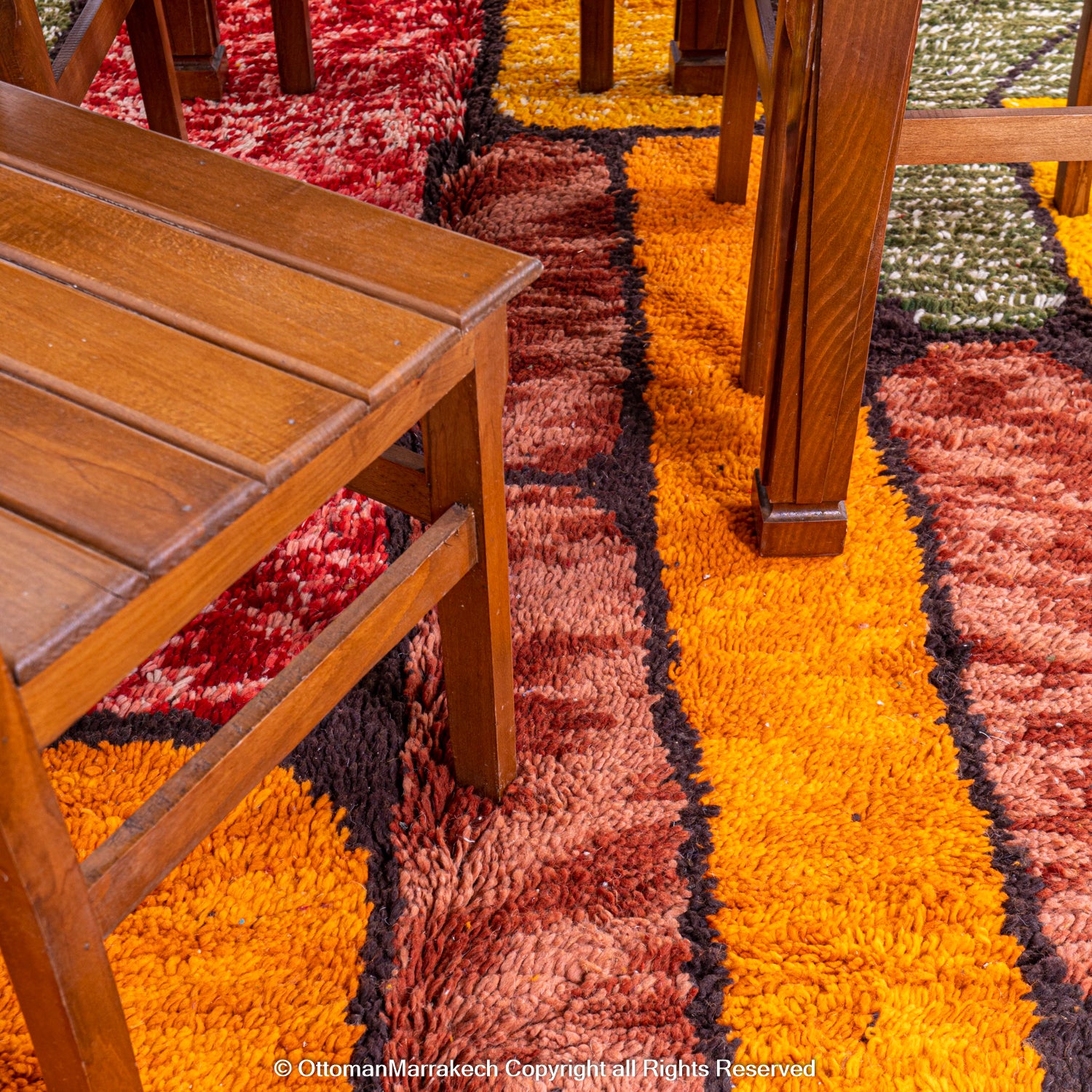 This stunning geometric Berber rug features a vibrant combination of earthy tones and bold colors like deep reds, oranges, and rich greens. Handcrafted by skilled artisans, the rug's intricate design offers a striking, abstract interpretation of traditional Berber patterns. The interplay of shapes and colors brings a sense of modern artistry while still maintaining its cultural roots.