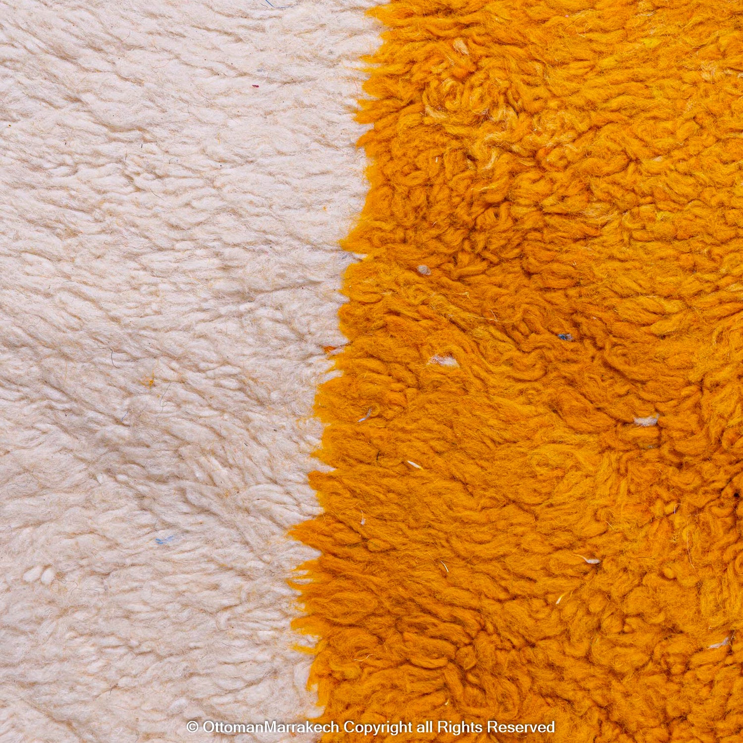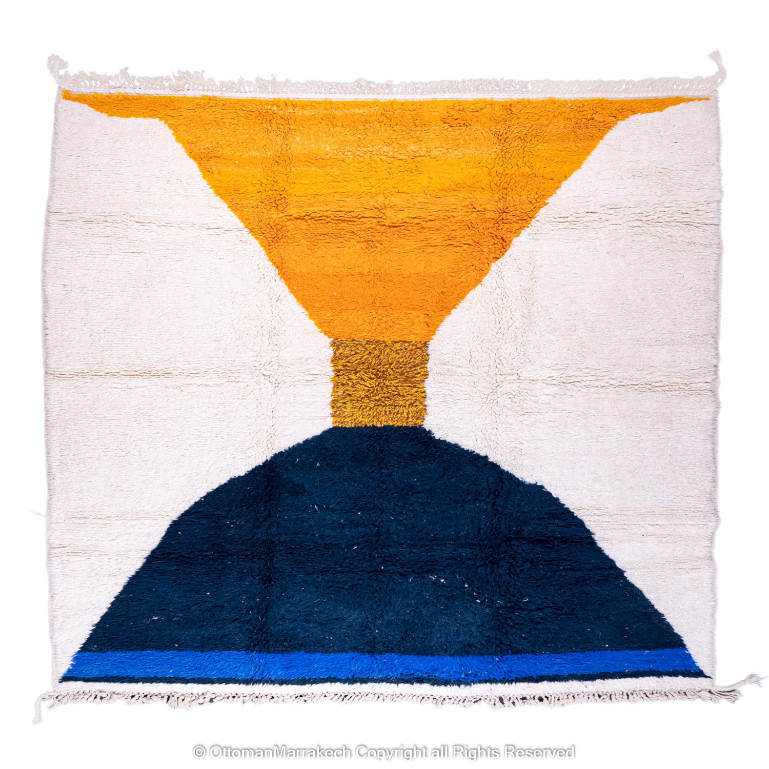 This unique handmade Moroccan rug features a striking combination of bright orange and deep blue geometric shapes against a neutral white backdrop. Its bold design makes it a perfect addition to any contemporary living room, bedroom, or office space. The soft wool texture provides warmth and comfort, while the vibrant colors bring life to any room.
