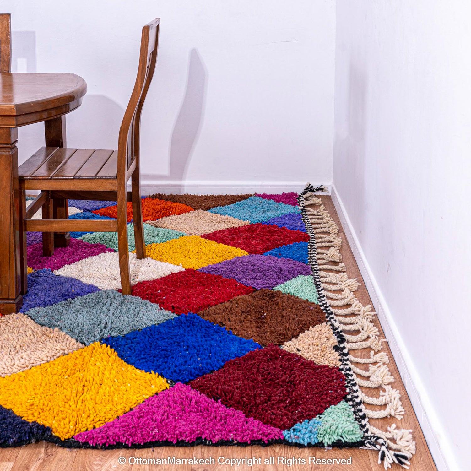 Infuse your space with the lively energy of this Vibrant Harlequin Moroccan Berber Rug, showcasing a striking multicolored diamond pattern. The bold and playful arrangement of colors – from bright reds and oranges to cool blues and greens – creates an eye-catching statement piece that will uplift any room. Each diamond is carefully handwoven by skilled Berber artisans, ensuring both a beautiful design and lasting quality.