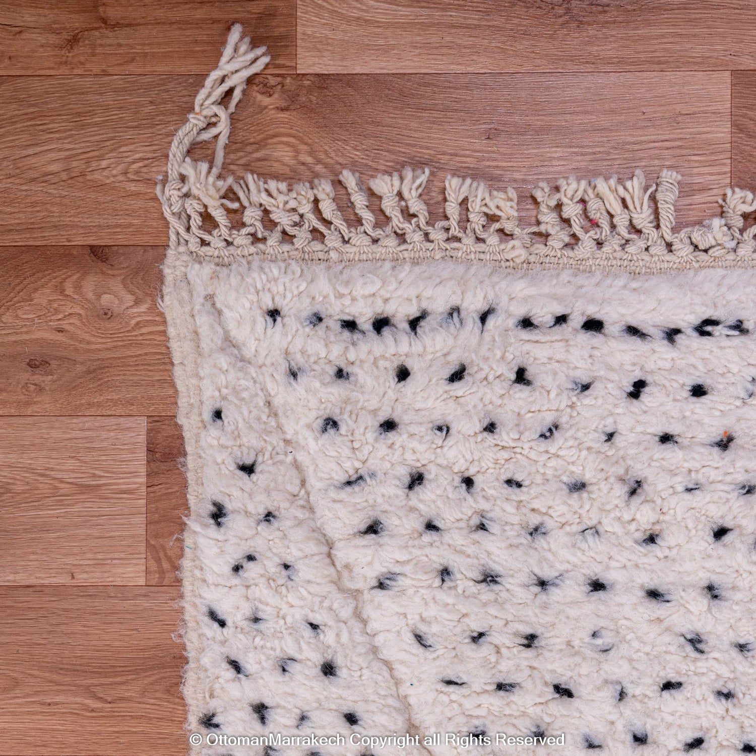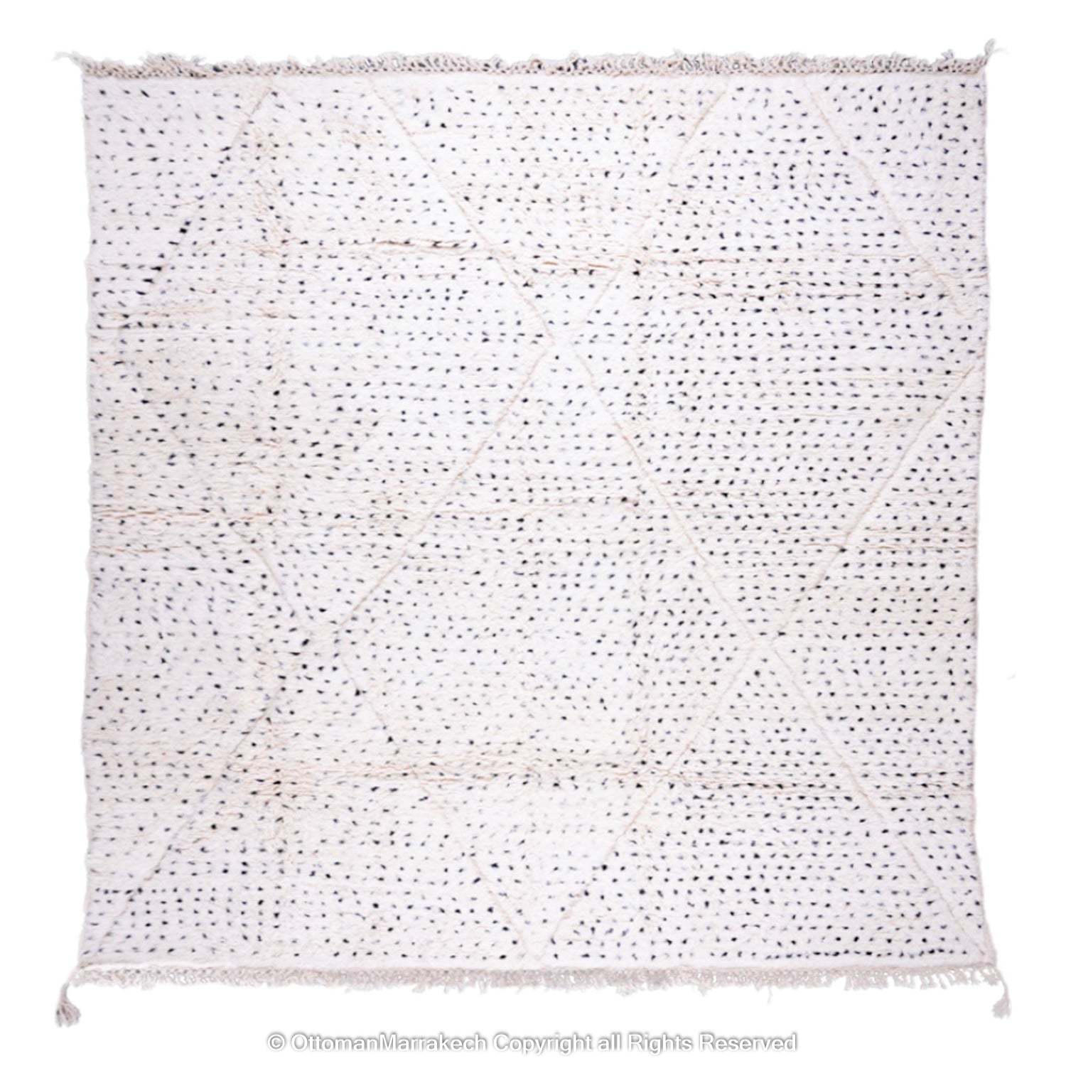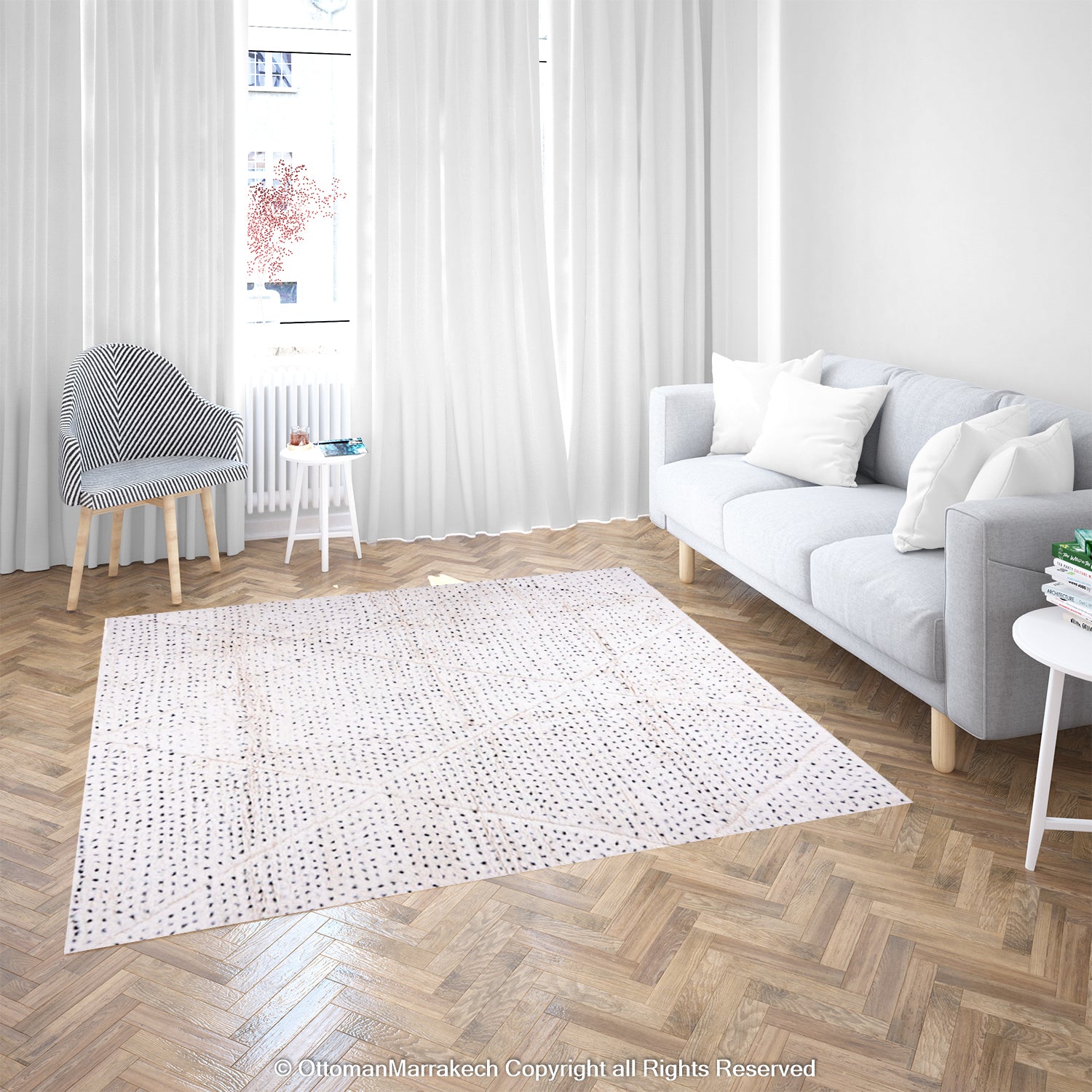 This elegant white wool rug is designed with plush softness, featuring shaved diamond lines that add a touch of subtle geometry. The rug is tastefully decorated with small black dots that create a beautiful contrast against the natural white wool, offering a modern yet timeless appeal.
