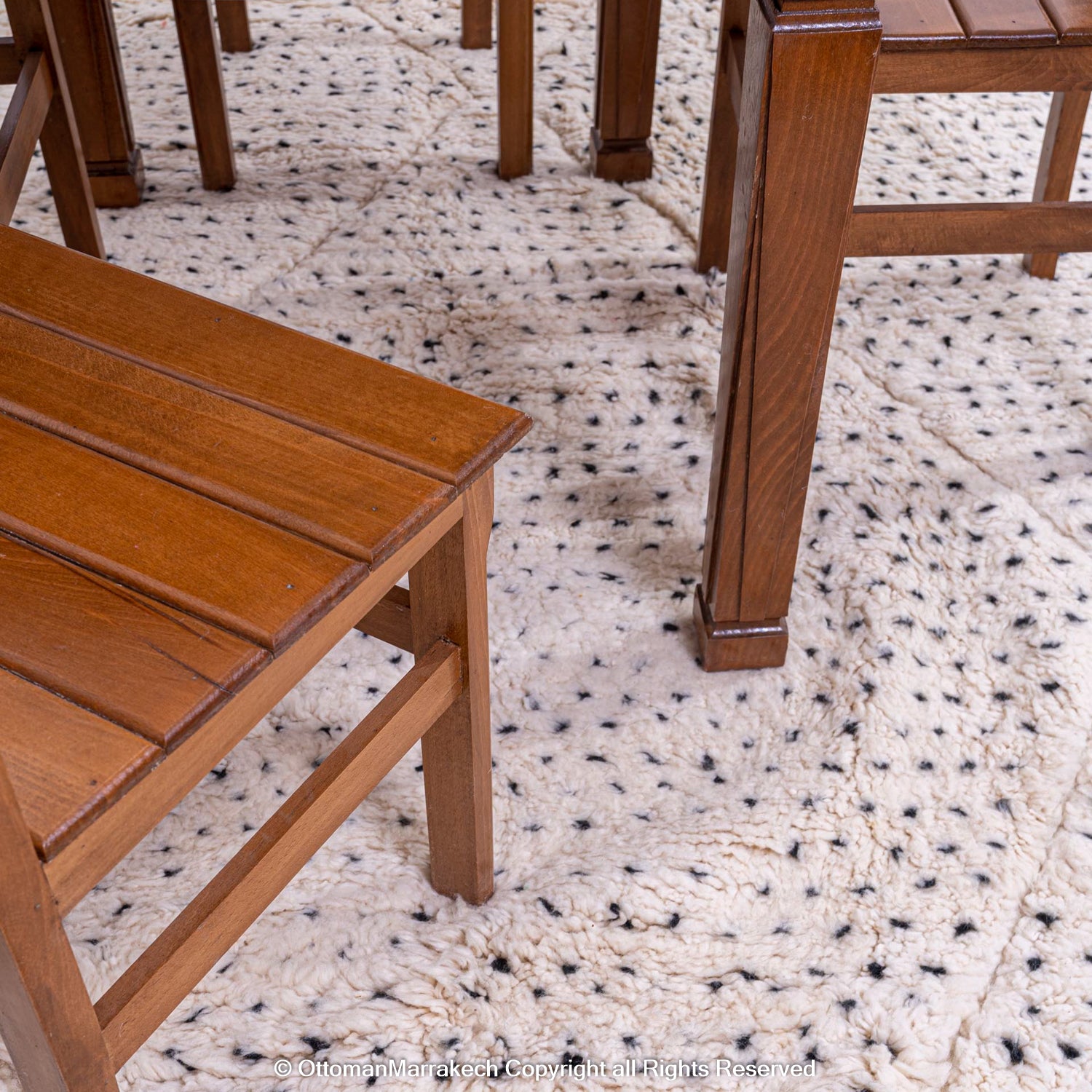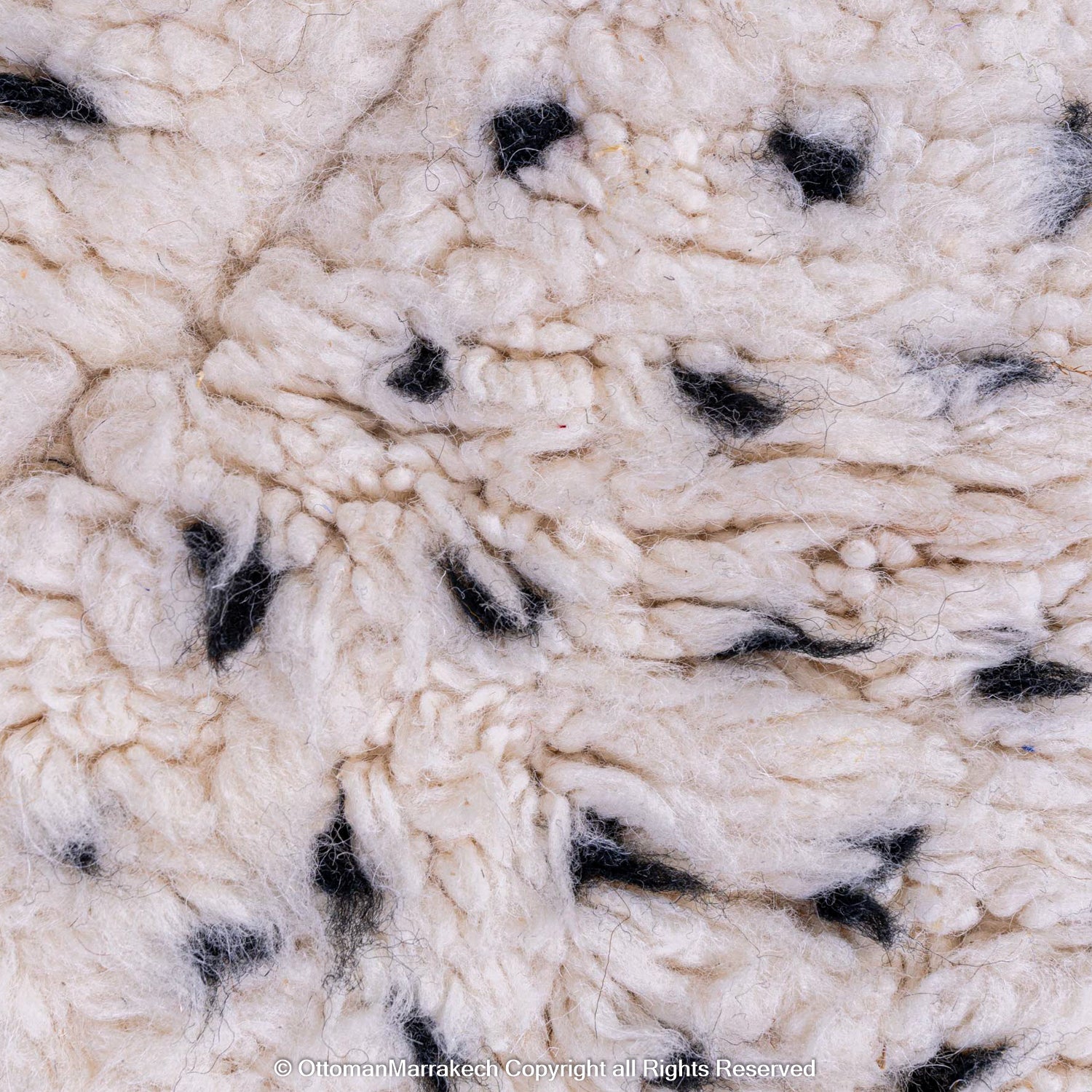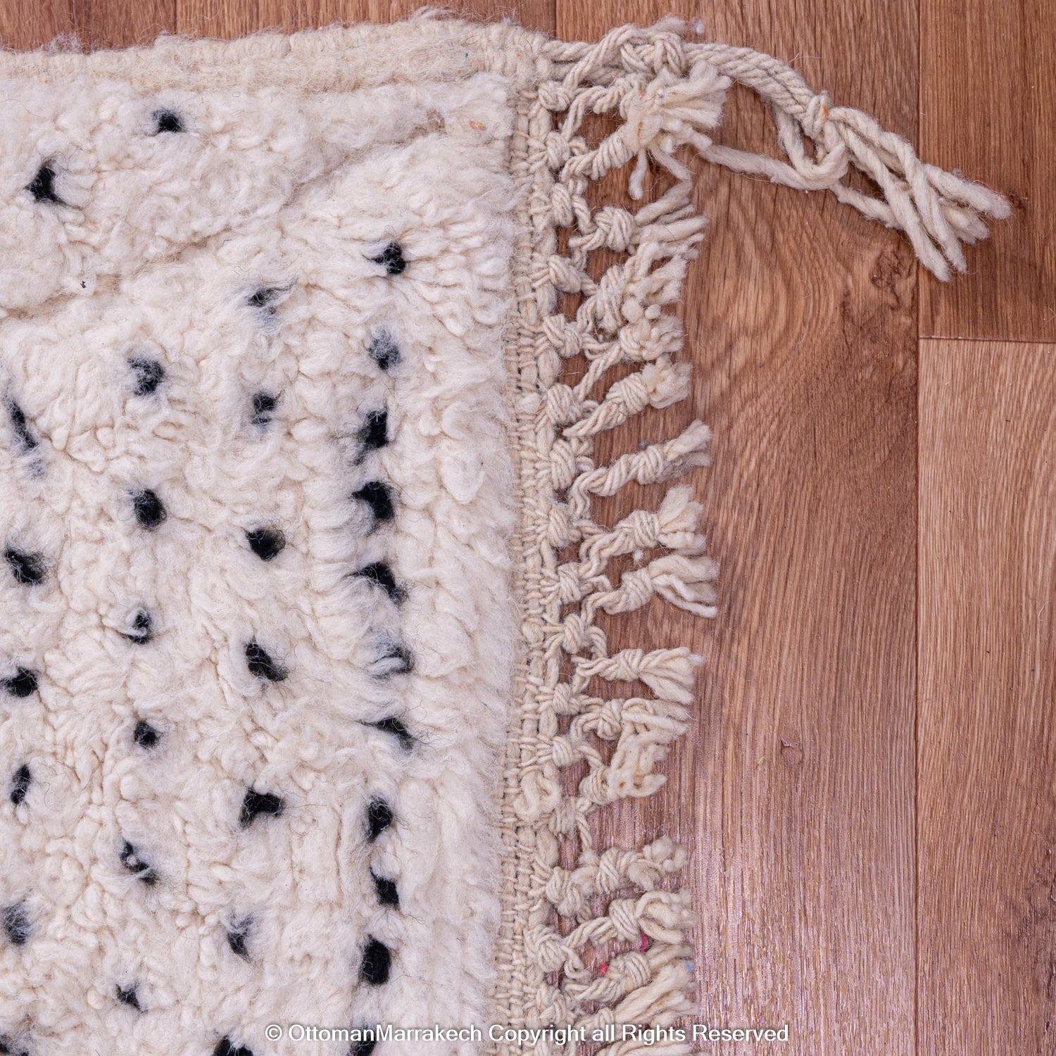 This elegant white wool rug is designed with plush softness, featuring shaved diamond lines that add a touch of subtle geometry. The rug is tastefully decorated with small black dots that create a beautiful contrast against the natural white wool, offering a modern yet timeless appeal.