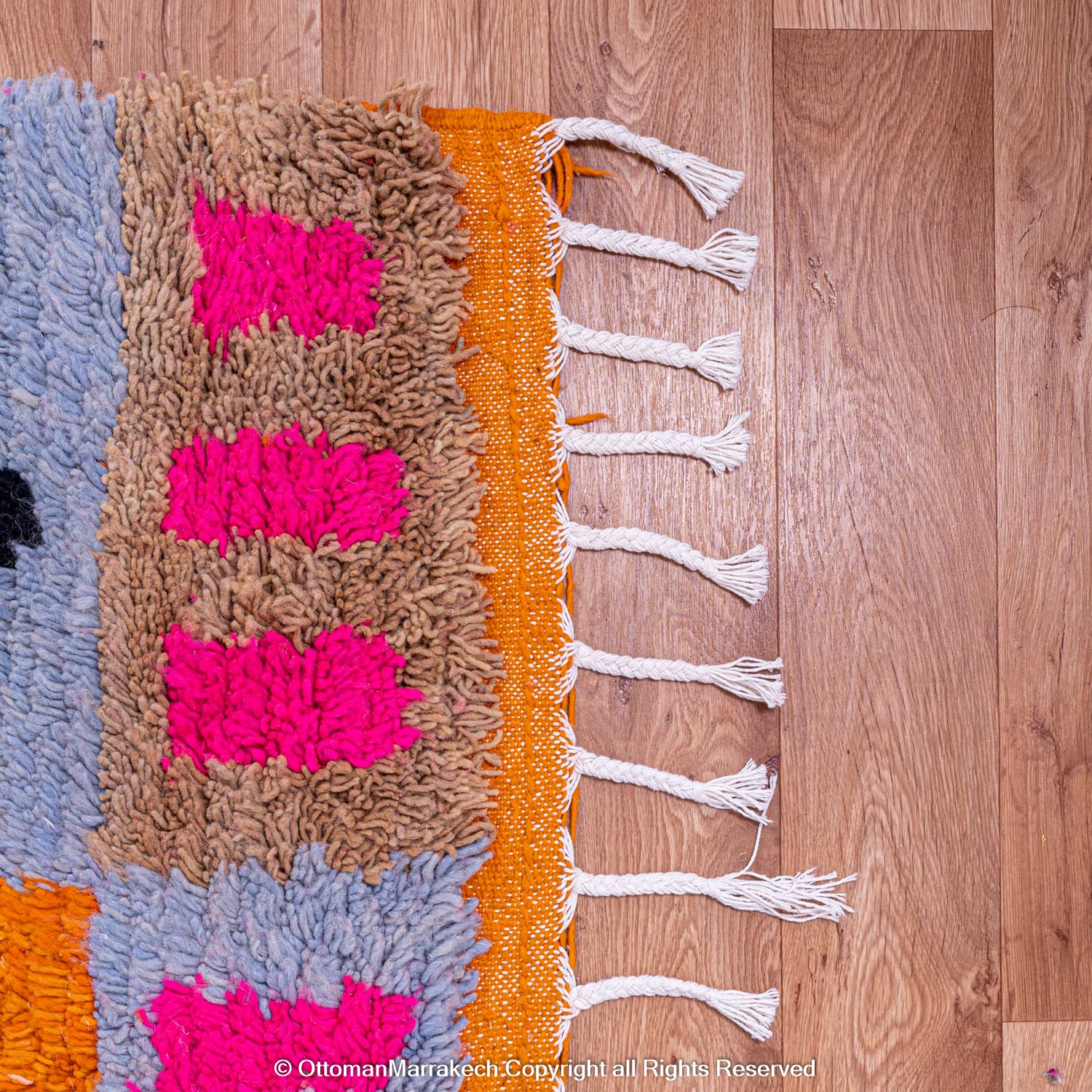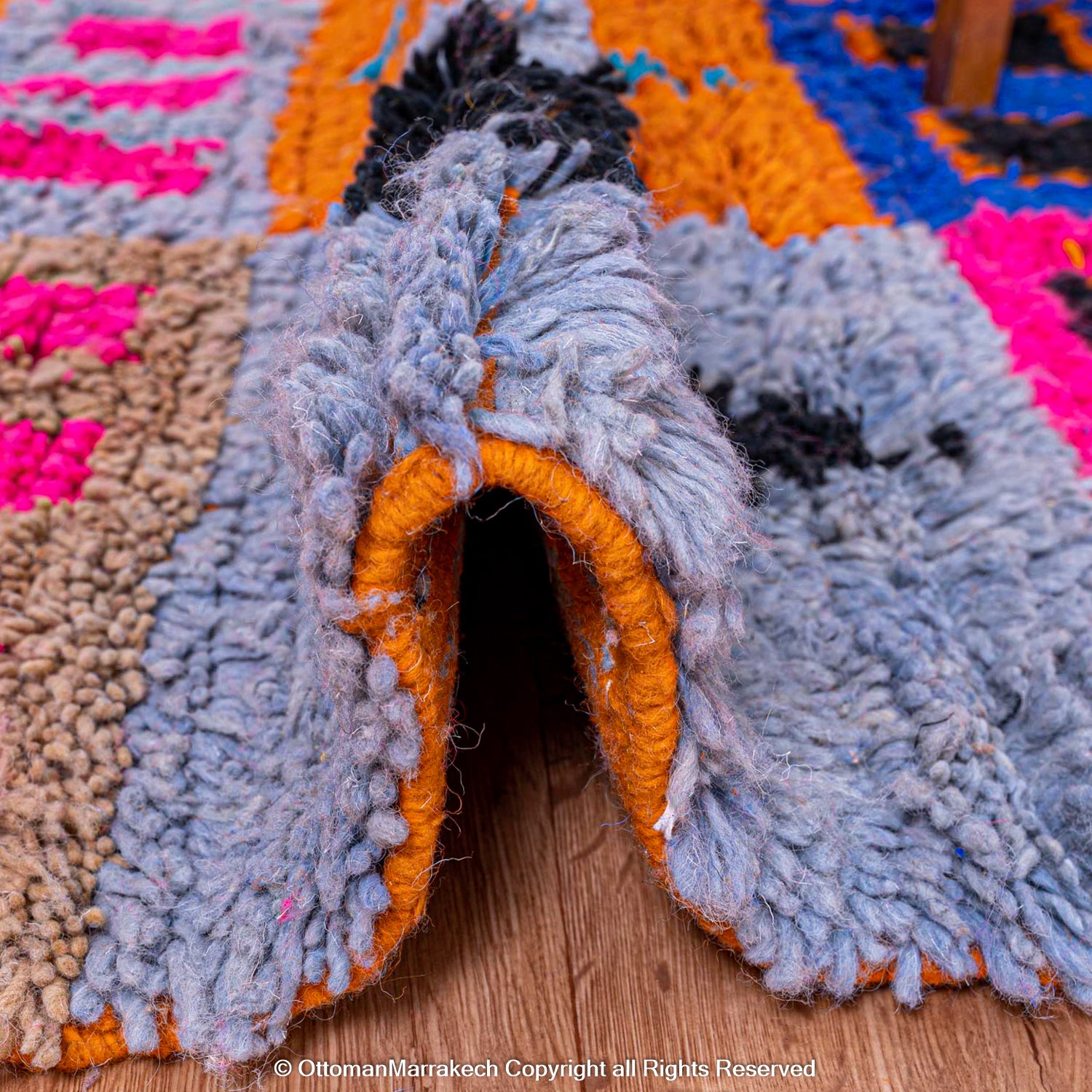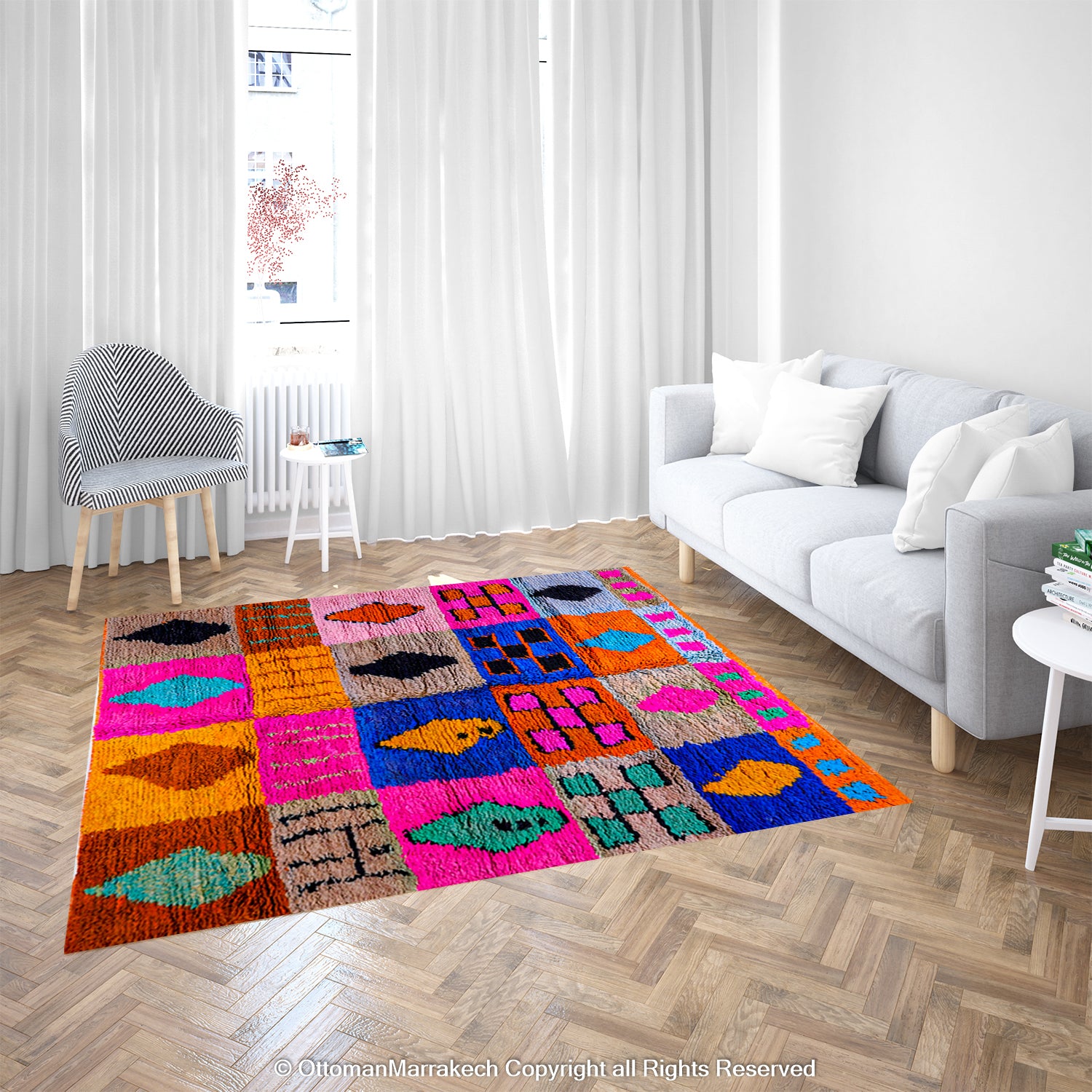 This vibrant patchwork Moroccan rug features a stunning array of geometric shapes and bold colors. Handwoven by expert artisans, the rug combines traditional Berber motifs with a modern aesthetic, creating a striking visual contrast of orange, pink, teal, and blue. Each square holds a unique design, from diamonds to abstract forms, making this rug a statement piece that brings life and energy to any room.