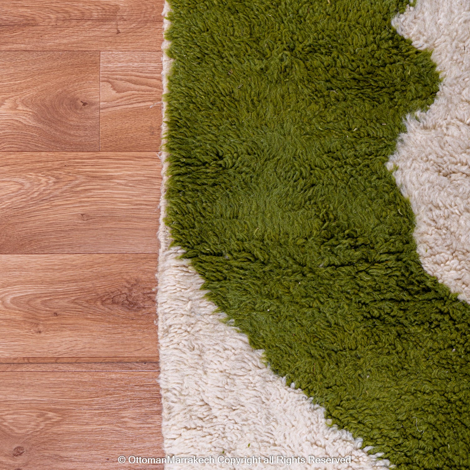 This Olive Green Abstract Moroccan Rug showcases a bold, modern design with striking olive green and natural cream hues. The abstract pattern creates a captivating visual effect that adds an artistic and contemporary touch to any room. Handwoven by skilled Moroccan artisans, the rug’s rich colors and plush texture offer both comfort and style.